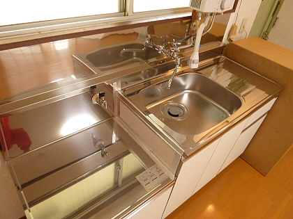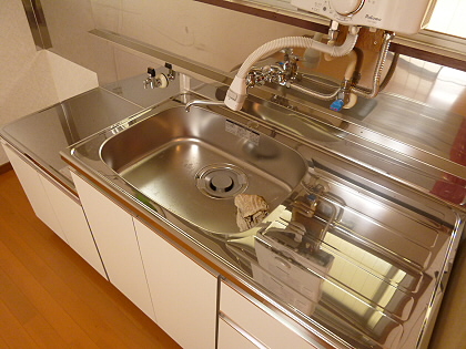 シンク広々2口ガスコンロ設置可能のキッチンになります。上下に収納付きになるので